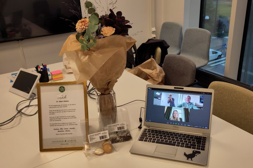 Nu har det blivit dags att lämna över stafettpinnen till en ny neurolog (som vi snart kommer att presentera). Men först ville vi såklart tacka Albert på riktigt. Tillsammans med hans assistent Maria lyckades vi smyga in ett ”mycket viktigt möte” i hans kalender, startade en insamling i forumet, tog fram ett diplom och fixade blommor och fika. I torsdags var det äntligen dags att överraska honom på Nya Karolinska i Stockholm – med @qbert på plats och @ellenrosika och @jeanettel från styrelsen med via Zoom.